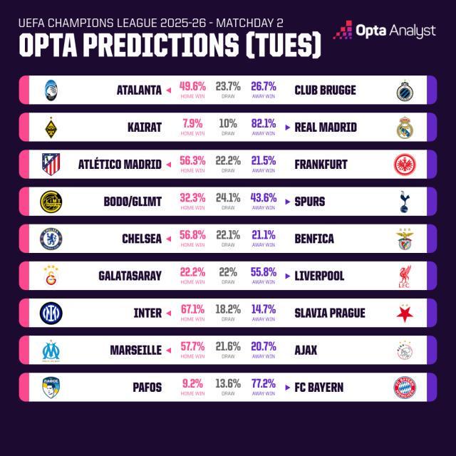 今夜欧冠联赛第二阶段开打,共有9场较量上演,包括皇马、拜仁、马竞、国米在内的多支传统强队均将再度登场。不过总体来看,9场之中并没有对阵双方量级相同的强强对话重头戏,更多是“强弱分明”的对决。所以由Opta模拟推演出的比赛结果也大都“一边倒”,强队获胜概率超过70%的比赛就有两场,70%以下50%以上的则有5场。